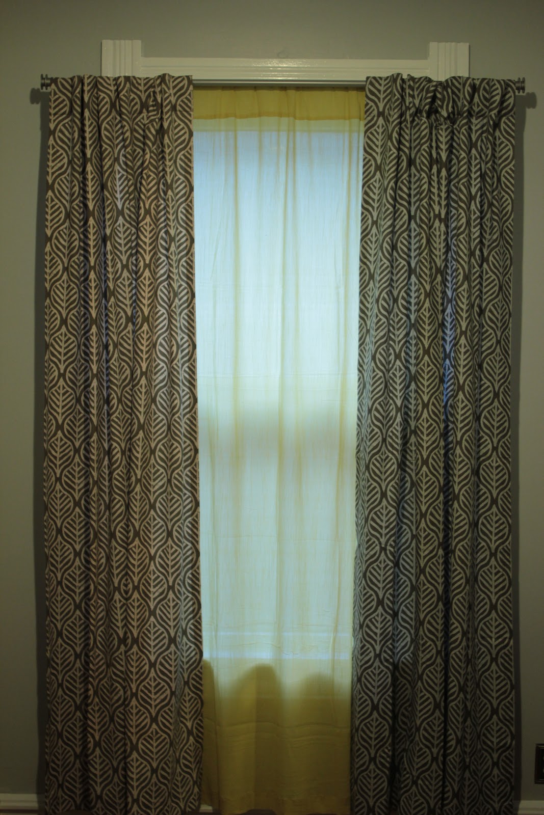 Remember this photo? This is what I was hoping the windows would look like when I was done: a couple of grey patterned panels over a golden yellow crinkle sheer, all from West Elm.