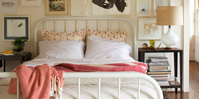 Here’s a nice “grown up” room. I think this one looks so cozy. If I were a guest at this house, I’d love to curl up with all those blankets (from Schoolhouse Electric, by the way) and look through the books on the nightstand. And isn’t that white lamp also fantastic? (I’m assuming it’s Schoolhouse Electric as well.)