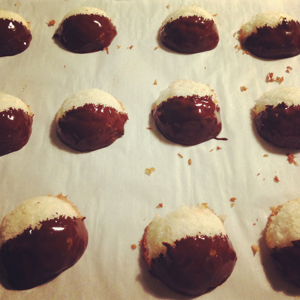 I made coconut macaroons dipped in chocolate for our girls annual cookie (& wine!) party.