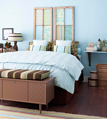 I saw this one on the Better Homes and Gardens site (after googling “awesome headboard”). This sort of fits our bill: it’s got the color to make it pop, and also that old timey feel with the old window panes. It’s really great, but I’m not a fan of headboards that are attached to the wall. I like them better when they’re attached to the bed.