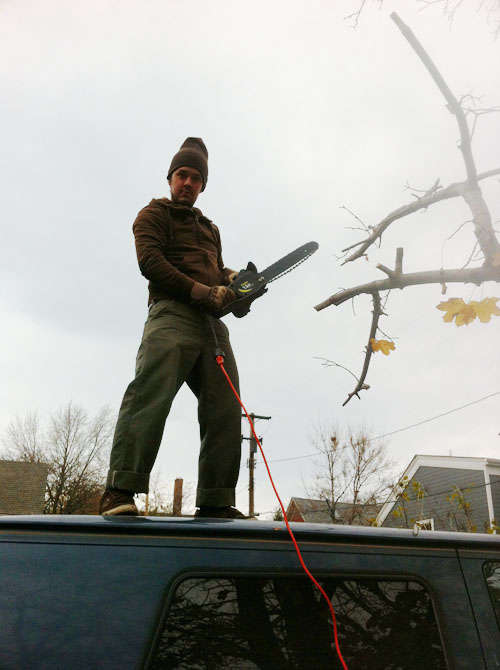 Don’t mind us… we’re just cutting stuff down over here. There’s a big old tree in our backyard that pretty much takes up the whole thing. You may remember it from last week’s let’s climb a tree post. I’m usually a tree hugger, not a tree hater, but I’ll just go ahead and admit it: I hate this tree. It makes a huge mess of our yard with leaves and seeds, and it keeps the yard so shaded that grass won’t grow. Like everything else in our yard, it’s just too big for the space. We’ve toyed with the idea of having it cut down, and I think we will eventually. For now, though, we decided to take a chainsaw to the lowest branches.
