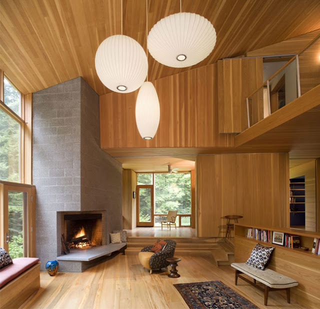 This room by architect firm Gray Organschi takes my breath away. I’m not normally a minimalist. Usually I like rooms that are quirky and colorful, with a sense of personality and comfy chairs. Stark, empty rooms normally leave me cold and bored. But this one. Oh, this one. There’s nothing stark or cold here. The warm wood covering floor to ceiling and everything in between is so inviting and comfortable, in contrast to the cool grey concrete fireplace. But really, it’s all about the lights. The curves of the pendant lights amongst all the sharp angles of wood and concrete are what make this room, well, I almost want to use the word “sexy,” but I’ve never said that word before and it feels so horribly awkward. But, you know, it’s good. This room is very good. What do you think? { photo from desire to inspire }