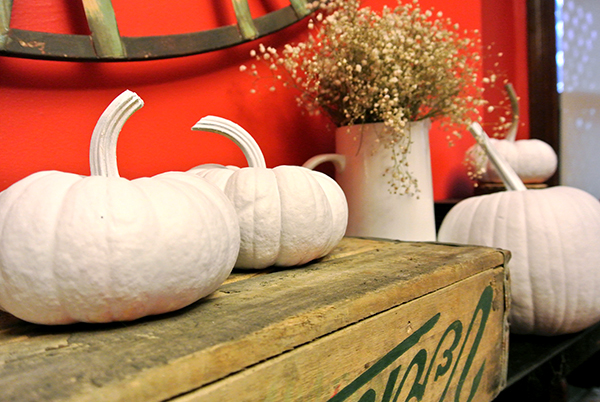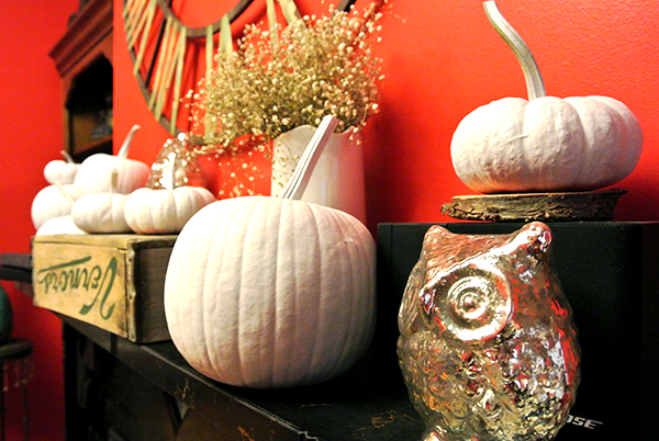 When I brought them inside, I arranged the white pumpkins on our fireplace with a few other pieces to give them varying heights and depths — some books with black and silver covers, an old crate, a couple of silver owls from West Elm, a pitcher with babies breath (from our wedding!), and the (not-so-cute) record player speakers that live on our mantle. I love the way the flat white paint plays against the pops of silver as well as the black mantle and red walls. I call these my ghost pumpkins. I think they turned out so cute, and it couldn’t have been easier!
