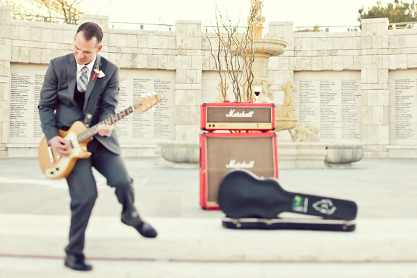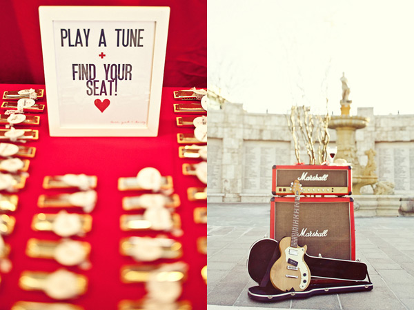 Hi everyone! Happy Wedding Wednesday to you! I hope you’re ready for a little rock n roll this morning. This Johnny Cash-inspired wedding features guitar picks instead of rice, harmonica escort cards, and an altar made of amps. I love it!