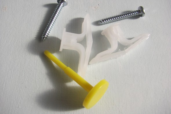Before drilling anything, we did some research on what would be the best screws and anchors to use on old plaster walls. Because these walls can crumble really easily, using screws alone runs the risk of the screw pulling out several inches of wall leaving a giant, horrible hole in the wall and your curtains crashing to the floor. That would be very bad. Our curtains are all fairly lightweight and the Ikea curtain rods are just plastic, but we still wanted to be sure that they’d be secure on the walls. We did some Internet research and also talked to a guy at the hardware store, and everyone suggested using anchors, which basically lock the screws to the wall. We settled on some anchors called pop toggles, little plastic wings that open up inside the wall, can hold up to 40 pounds, and look like this (photo from here):
